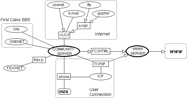 An analogous architecture has been adopted at Urbana-Champaign, Il, USA [6], but for the technical choice of the community server (Free Port instead of FirstClass).