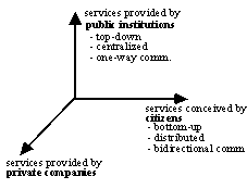 We have used Figure 1 to (qualitatively) appraise different "digital cities" (used, following [17], as a generic term). It is, however, important to stress that we do not see them as static points in (virtual) space. Rather, each initiative moves around over time. For instance, RCM, at the outset, lay essentially on the citizens axis, then moved up to integrate services provided by government institutions and is now moving toward the private-sector axis.